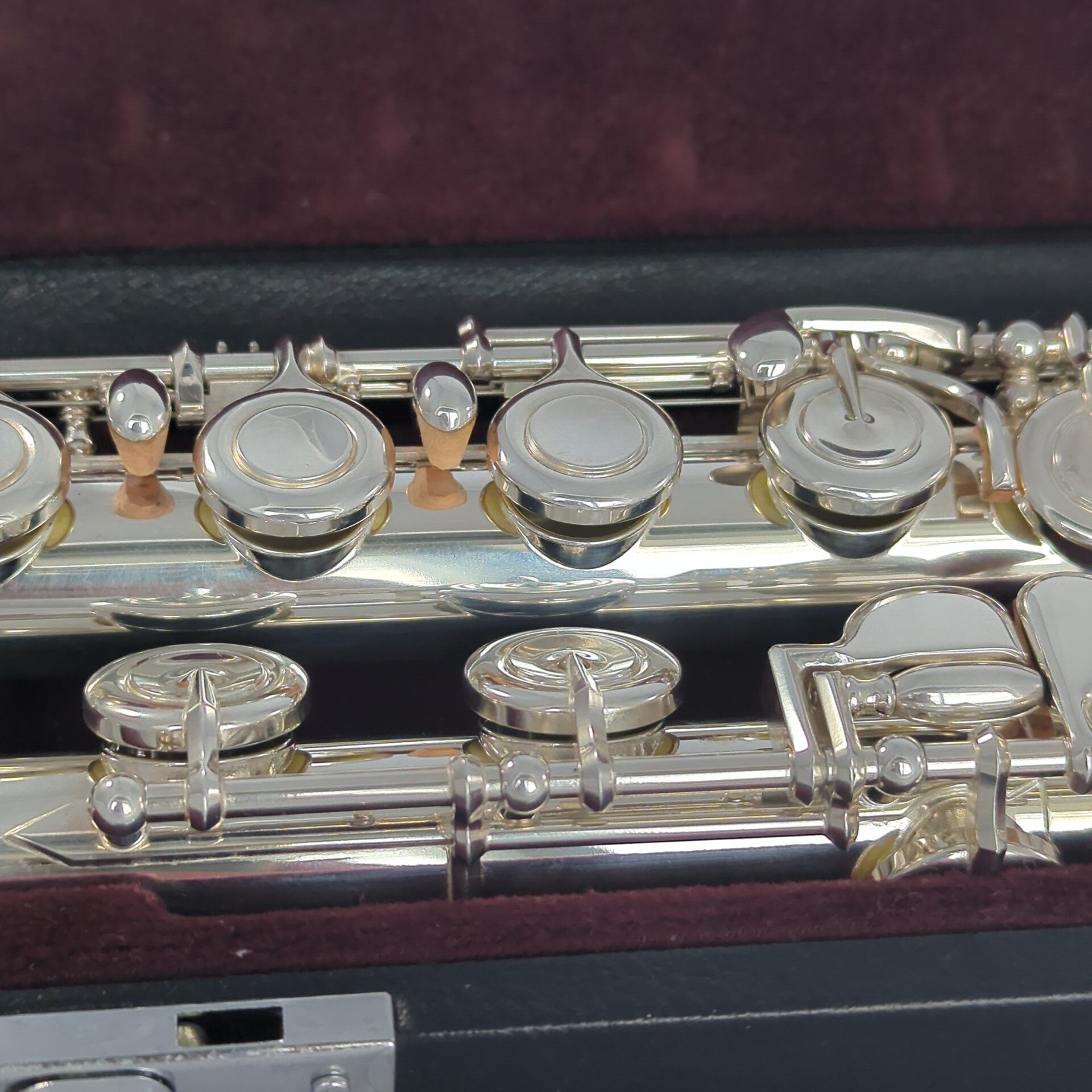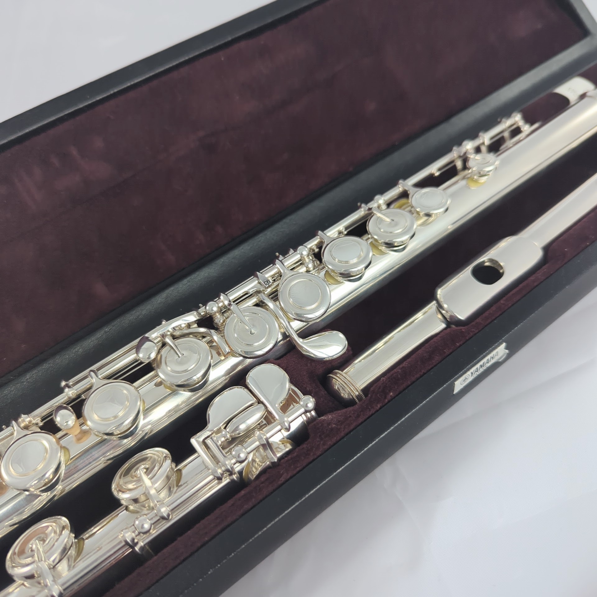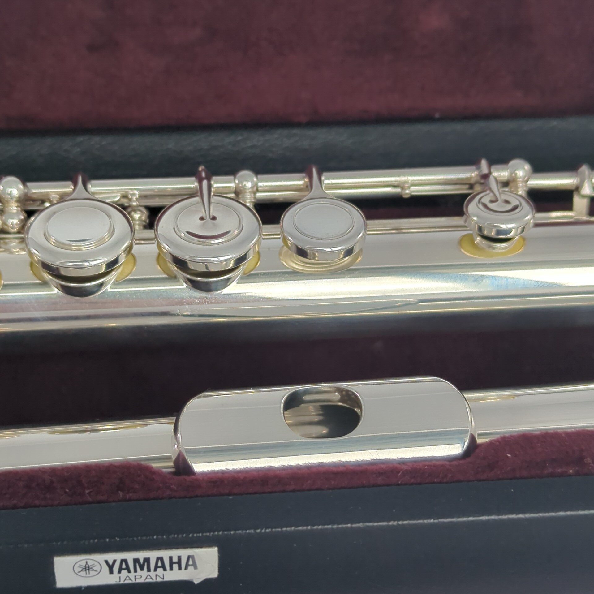 Flûte traversière semi-professionnelle Yamaha à plateaux fermés, pointes françaises, mécanisme facilitateur de Mi, fabriquée au Japon. La tête coupe EC est en argent sterling, le reste de la flûte est plaqué argent.  Mécanisme ultra précis, du même calibre que les flûtes des séries 6xx à 8xx. Mais à prix moindre car seule la tête est en argent.