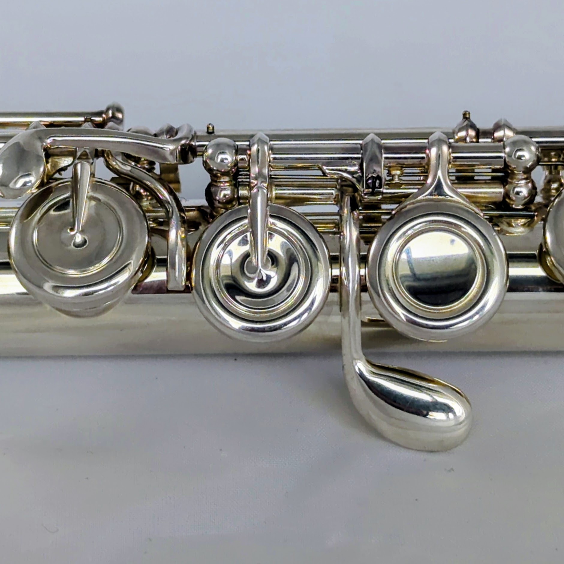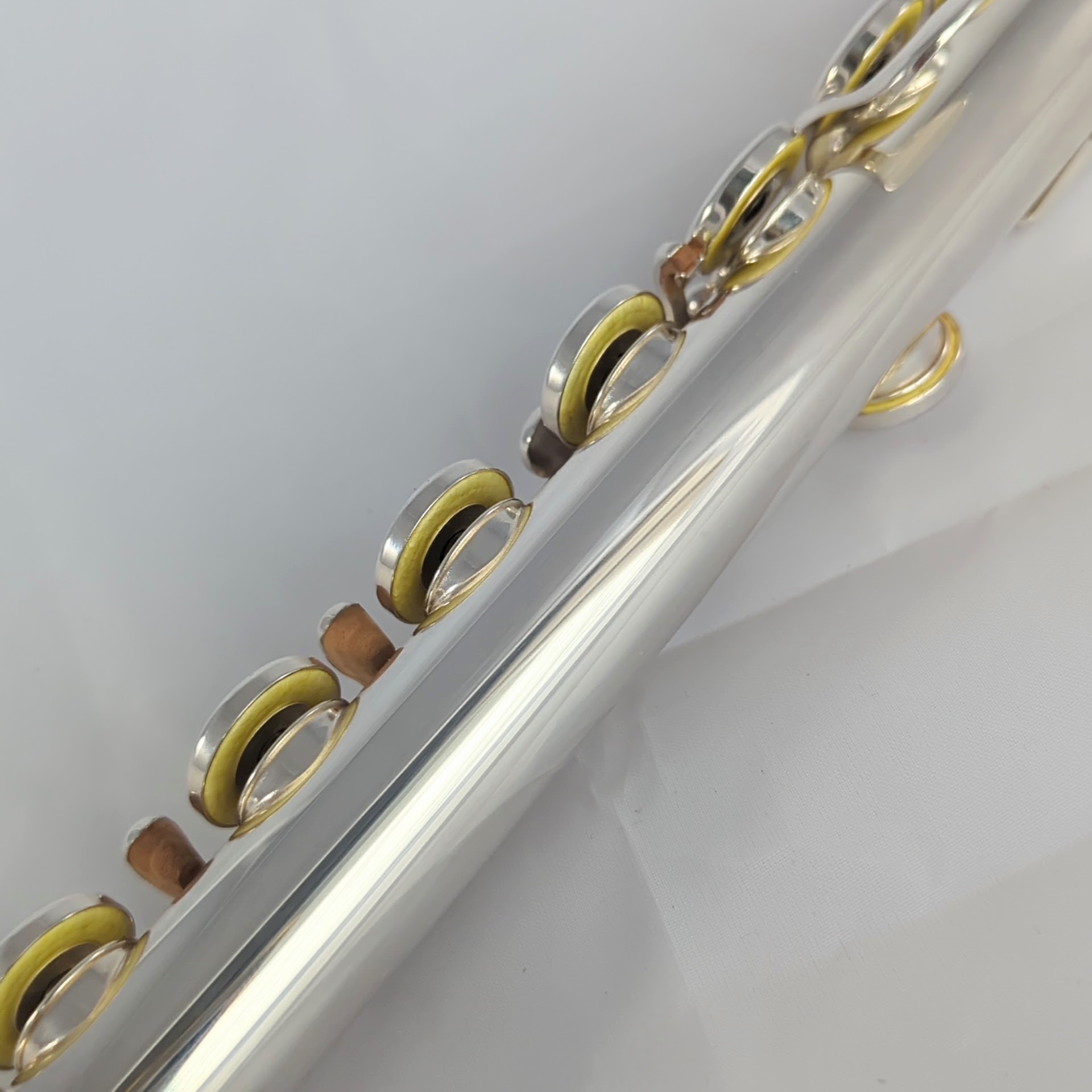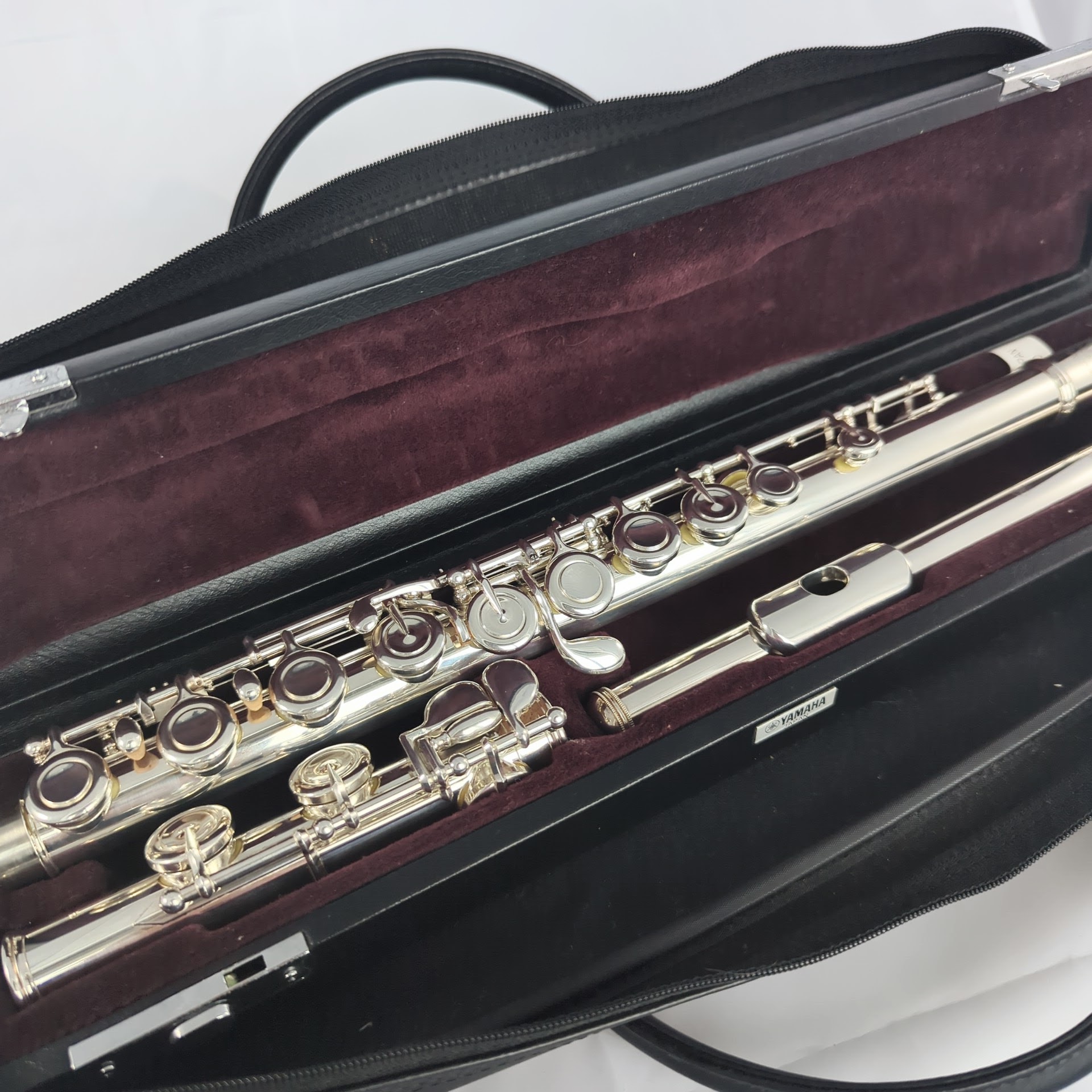 Flûte traversière semi-professionnelle Yamaha à plateaux fermés, pointes françaises, mécanisme facilitateur de Mi, fabriquée au Japon. La tête coupe EC est en argent sterling, le reste de la flûte est plaqué argent.  Mécanisme ultra précis, du même calibre que les flûtes des séries 6xx à 8xx. Mais à prix moindre car seule la tête est en argent.