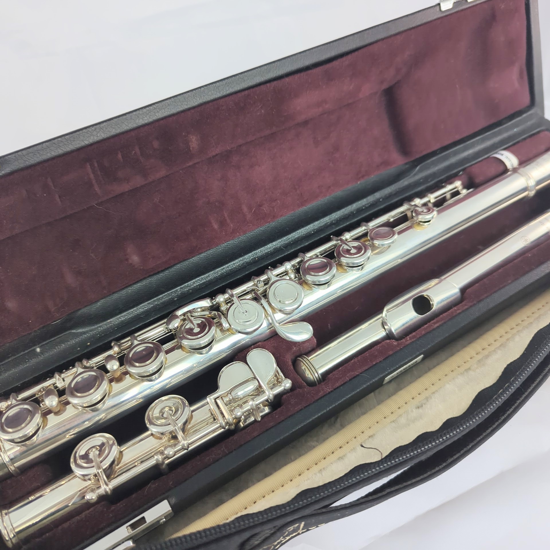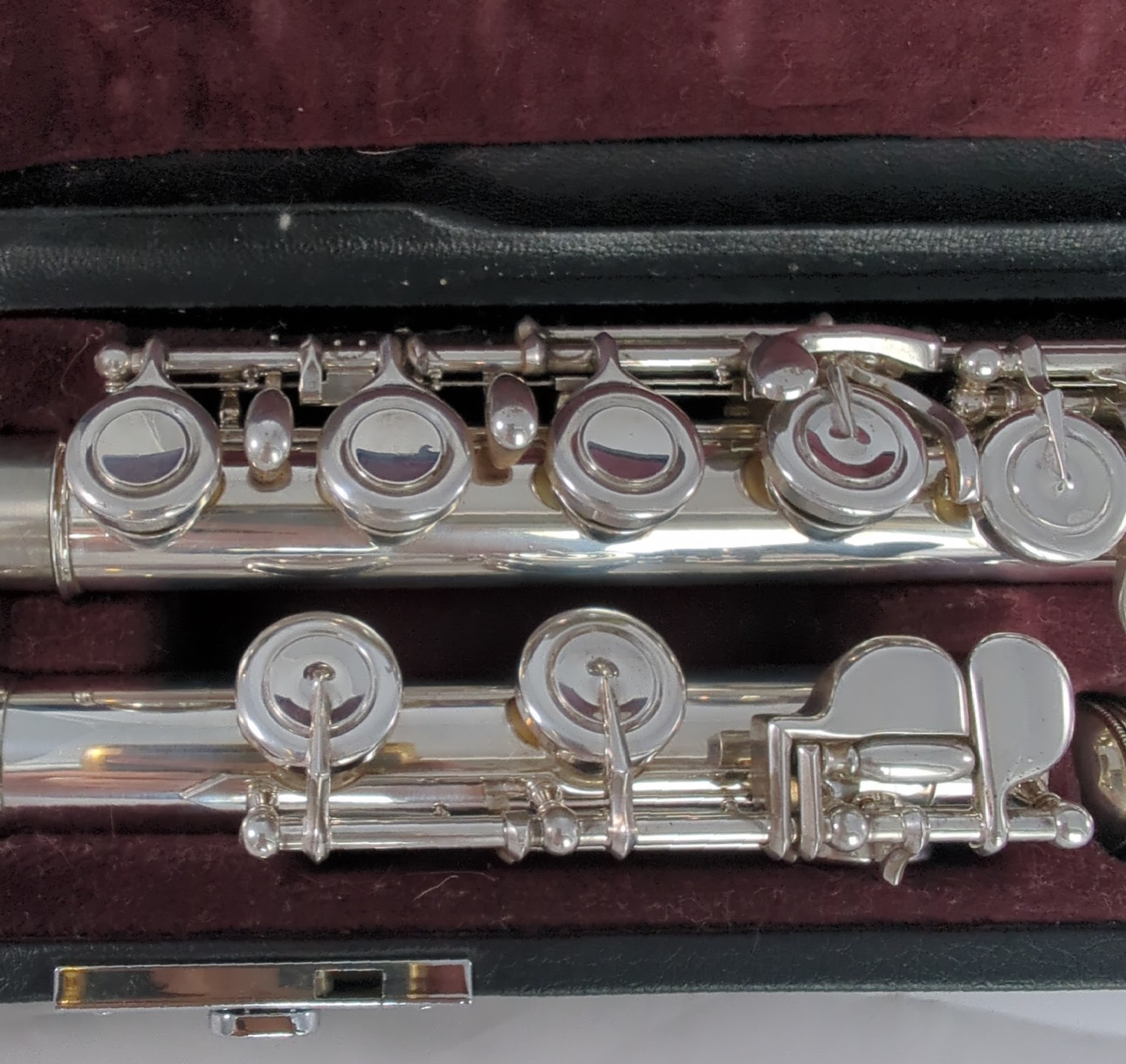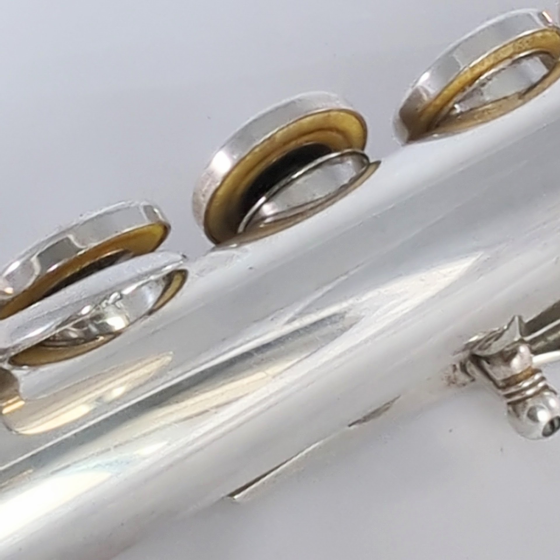 Fabriquée au Japon. Plateaux fermés avec pointes françaises, corps et clés plaqués argent, mécanisme facilitateur du mi aigu (split E). Elle est équipée de la tête en argent sterling coupe AM.