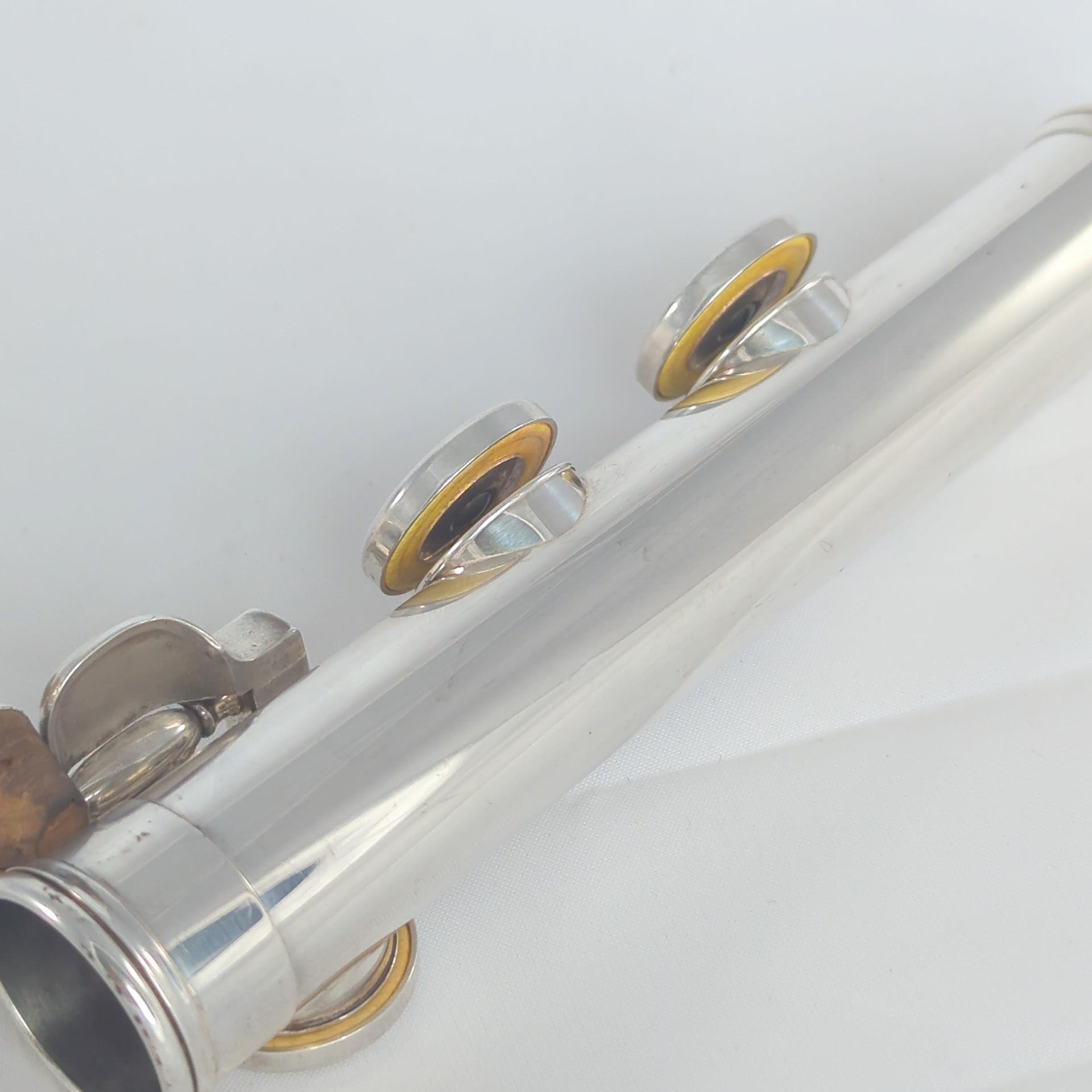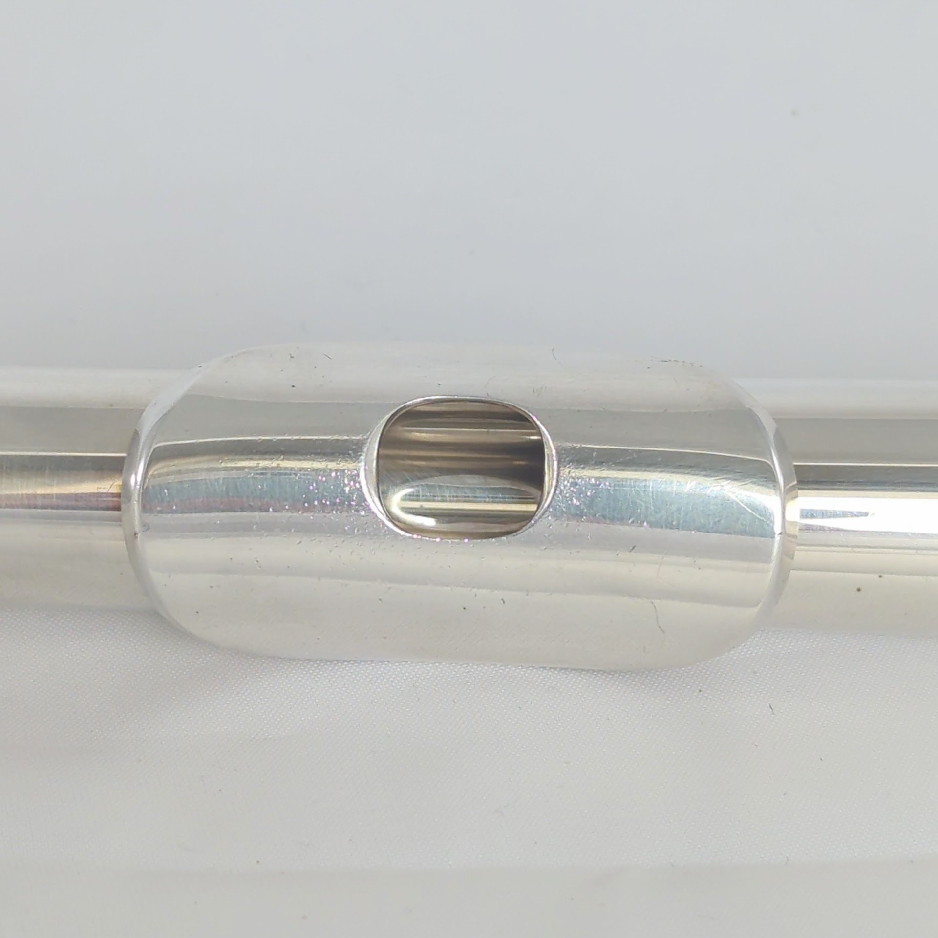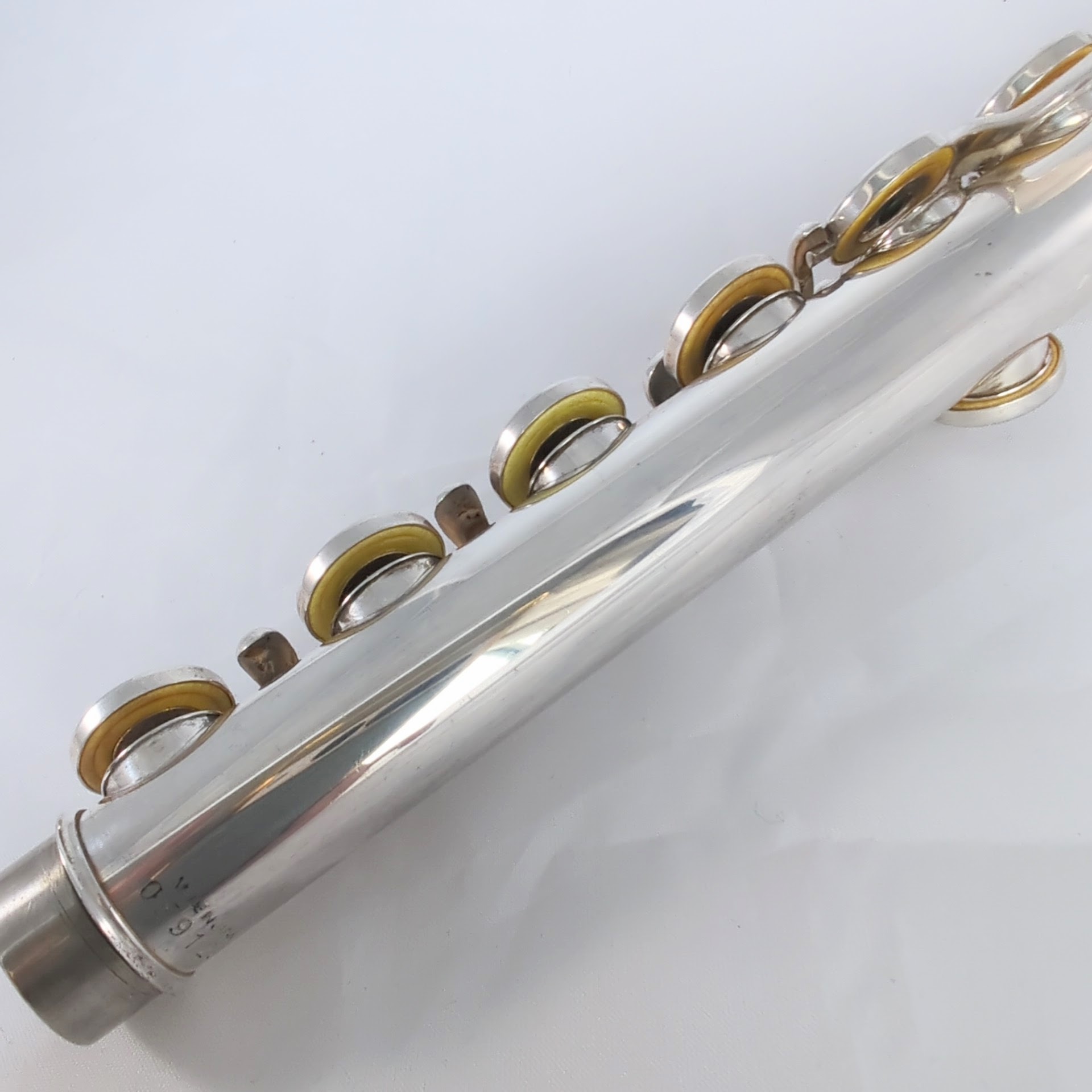 Fabriquée au Japon. Plateaux fermés avec pointes françaises, corps et clés plaqués argent, mécanisme facilitateur du mi aigu (split E). Elle est équipée de la tête en argent sterling coupe AM.