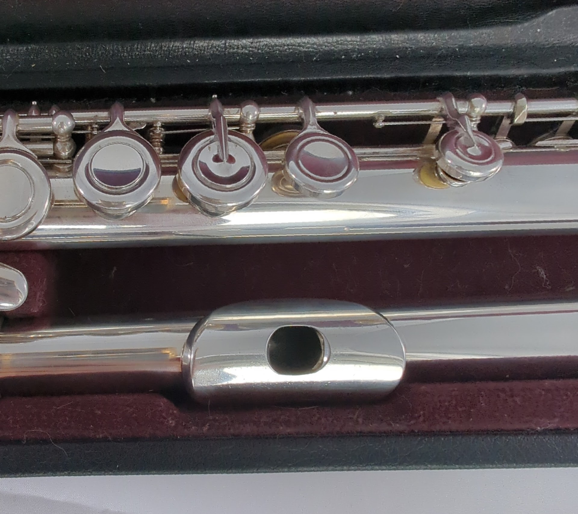 Esthétique: pas de poque ou égratignure importante sur le corps, mais petites marques de noircissement de quelques emplacements. Le placage de la plaque d’embouchure est criblé de petits trous, probablement causés par l’acidité du joueur précédent. Ceci n’affecte aucunement la performance de la flûte.
