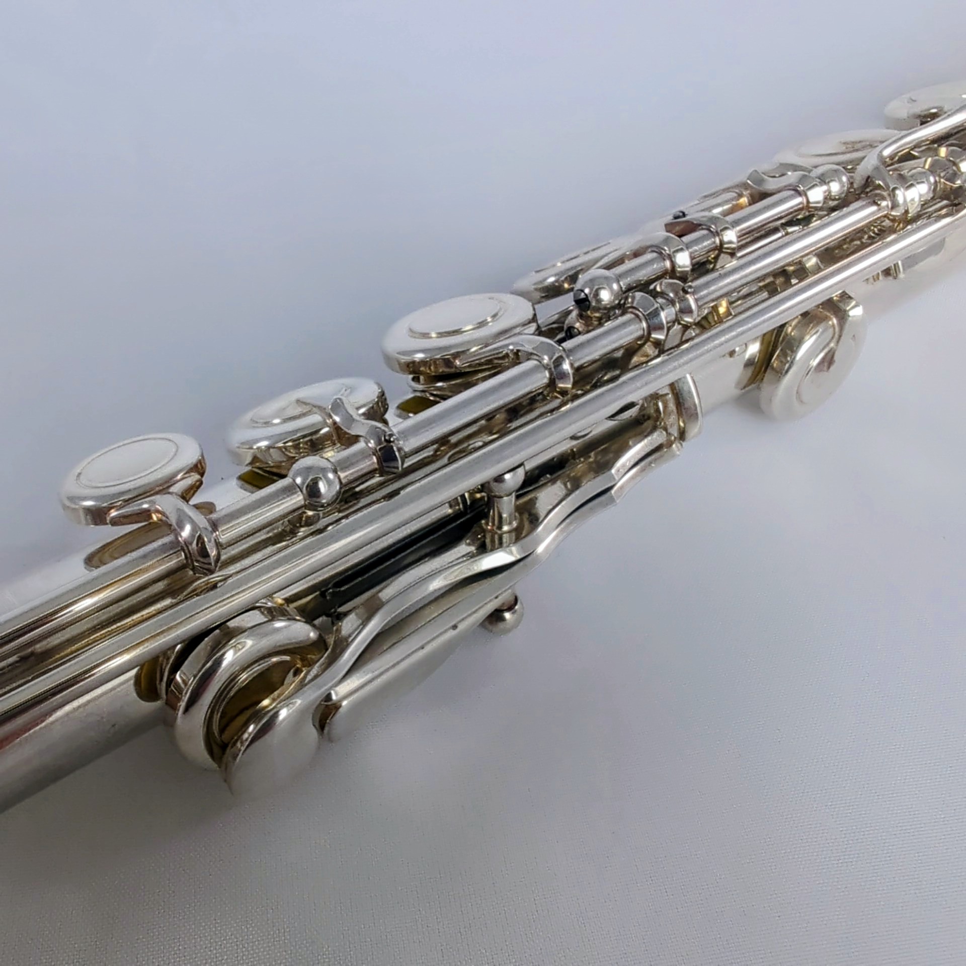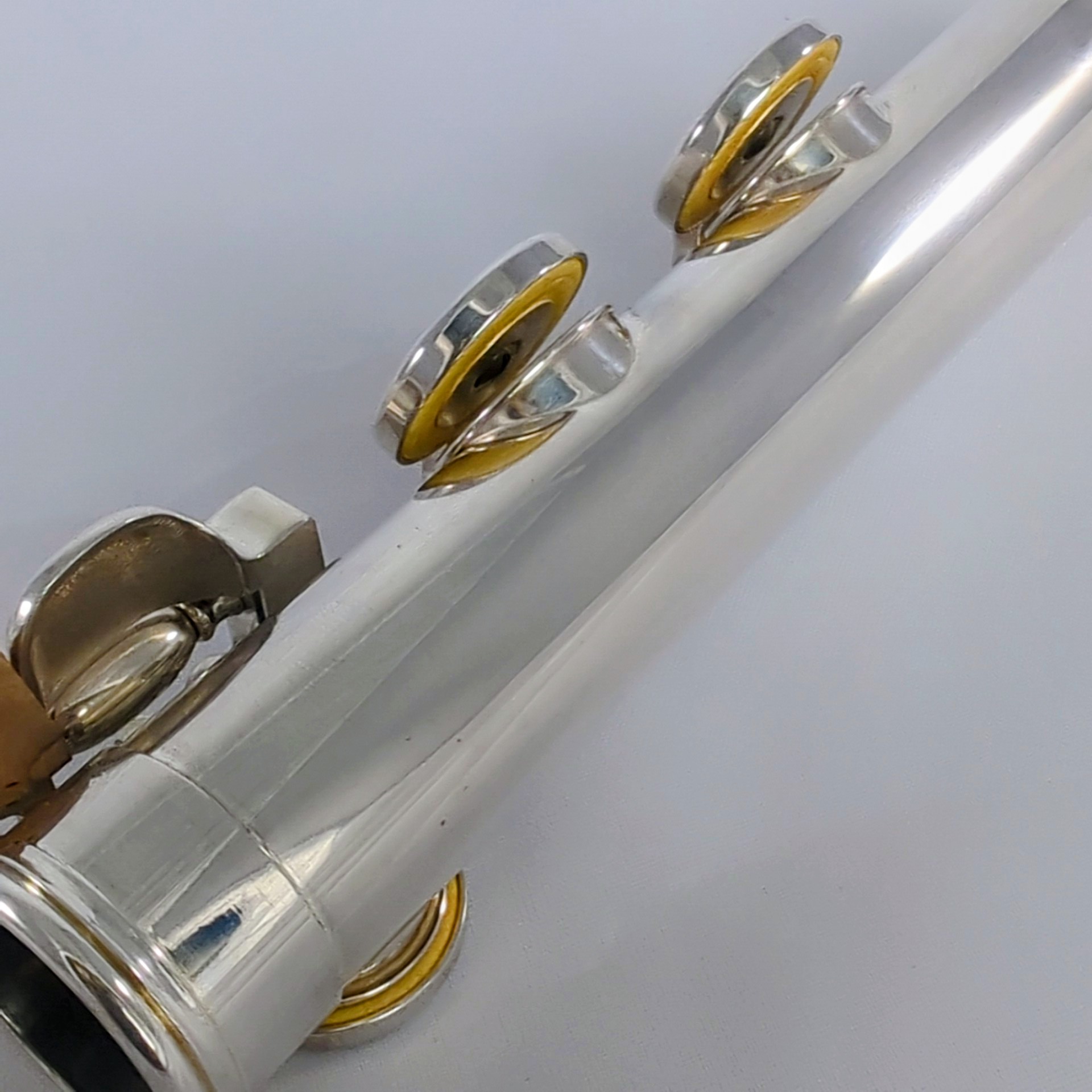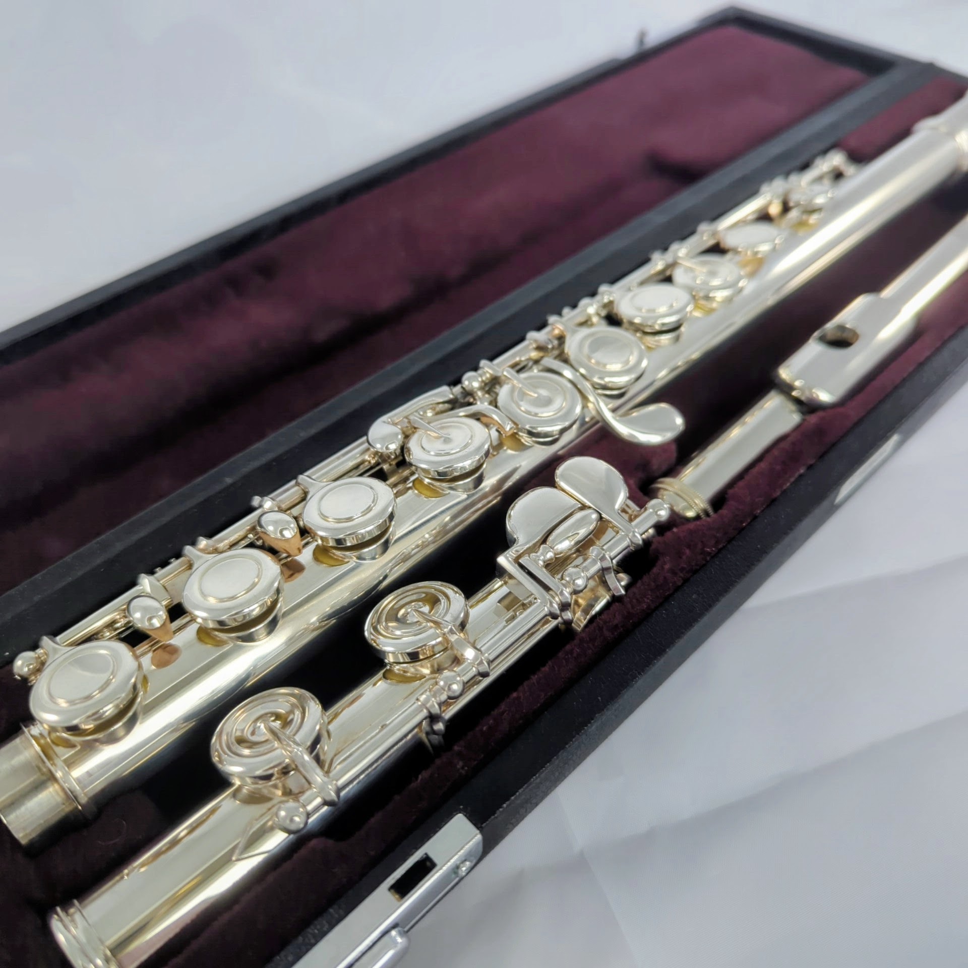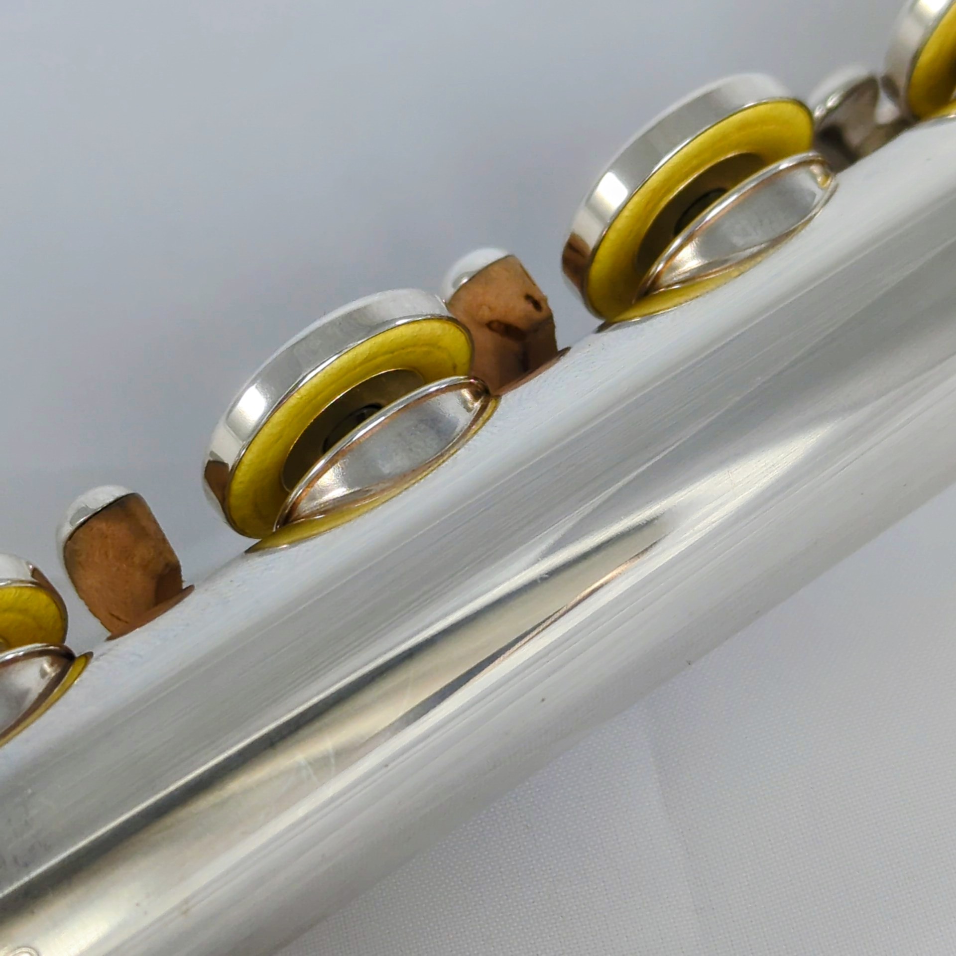 Flûte traversière semi-professionnelle Yamaha à plateaux fermés, pointes françaises, mécanisme facilitateur de Mi, fabriquée au Japon. La tête coupe EC est en argent sterling, le reste de la flûte est plaqué argent. Mécanisme ultra précis, du même calibre que les flûtes des séries 6xx à 8xx. Mais à prix moindre car seule la tête est en argent.